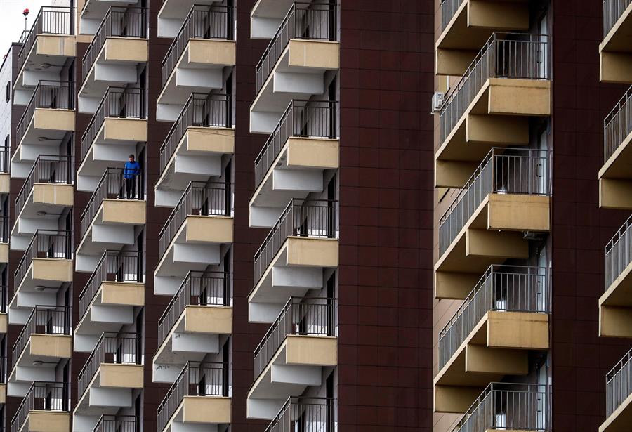 El 6 de abril en Karakol, Kirguistán, las autoridades cerraron así un bloque de apartamentos con docenas de familias después de que uno diera positivo por COVID-19.
