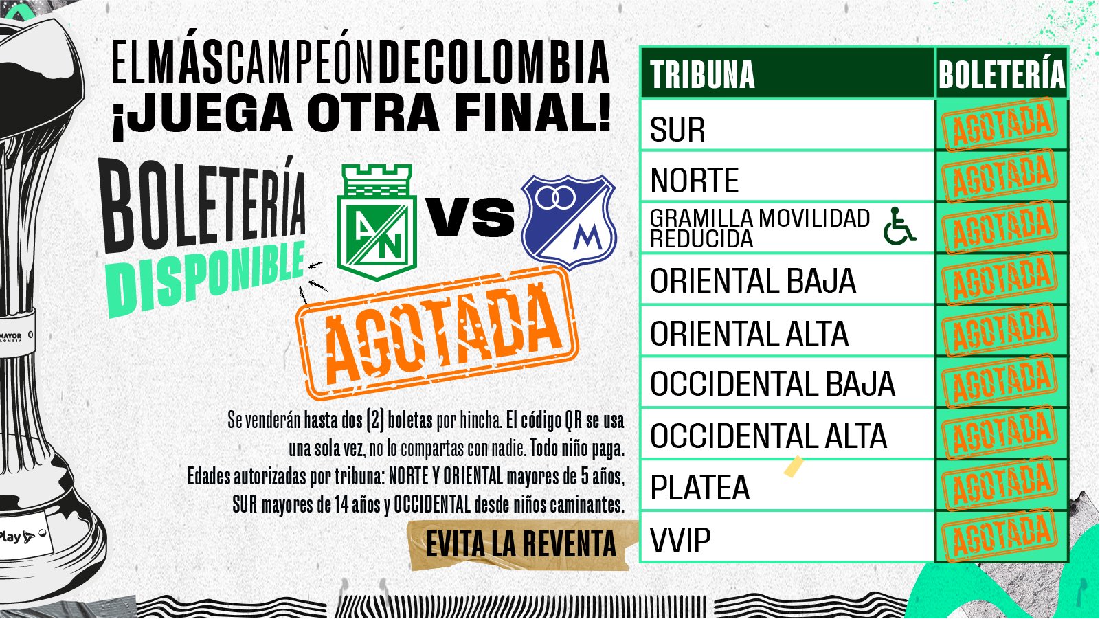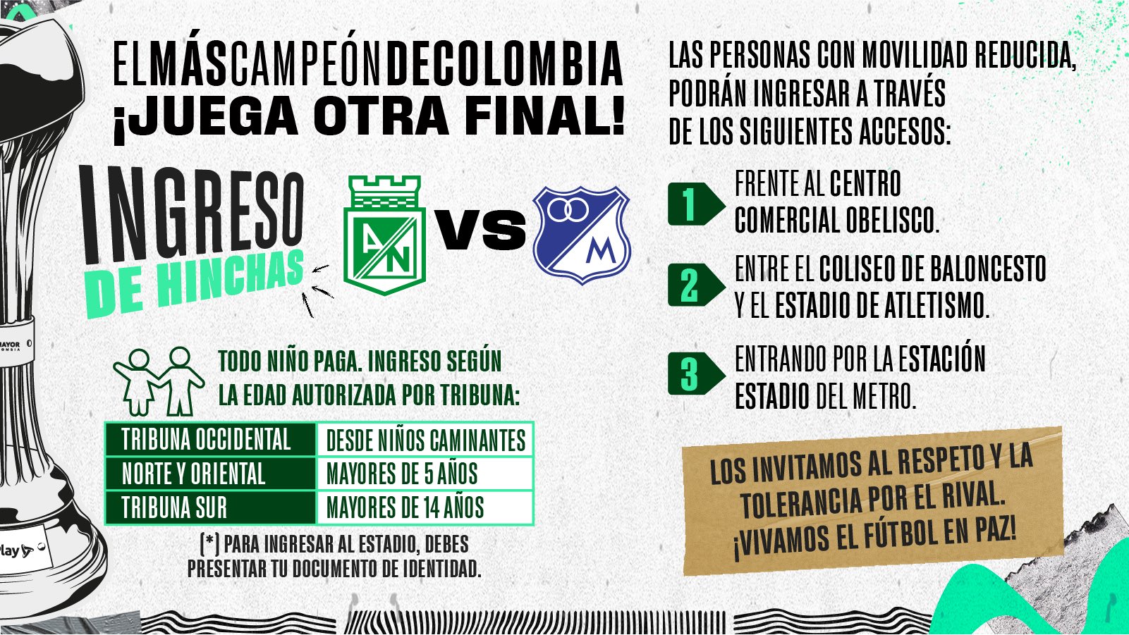 Lo primero a tener en cuenta es que todos los niños pagan y que la edad de ingreso de menores a las tribunas oriental y norte es a partir de los cinco años, en sur a partir de los 14 años mientras que en occidental para niños caminantes.