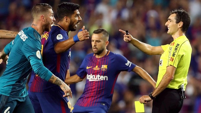El defensa del Real Madrid Sergio Ramos (i) y el delantero uruguayo del Barcelona Luis Suárez (2i) se dirigen al árbitro Ricardo de Burgos Bengoetxea (d) EFE