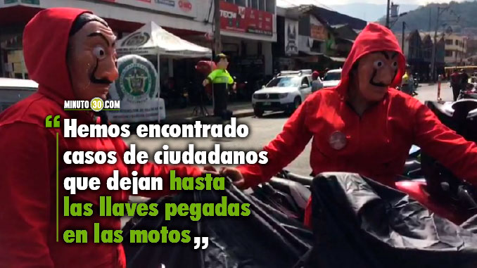 Varios motociclistas se llevaron un gran susto en la mañana de hoy, al creer que sus motocicletas habían sido hurtadas al estilo de la serie La Casa de Papel, lo que ellos desconocían era que se trataba de una puesta en escena pedagógica para hacer un llamado a la ciudadanía sobre acciones preventivas que deben tener en cuenta con sus diferentes objetos personales.