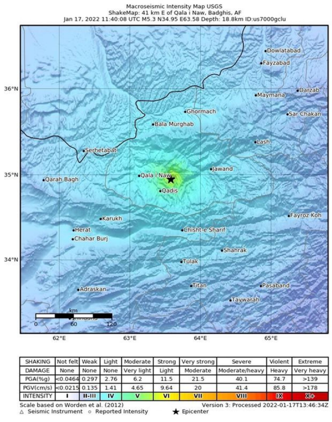 Este 17 de enero colapsaron algunas casas en Qadis, localidad de la occidental provincia de Badghis. La magnitud del sismo fue de 5,3, según el Servicio Geológico de Estados Unidos (USGS).