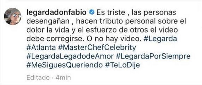 Fabio publicó en su cuenta de Instagram un corto aparte del videoclip, agregando una cruda descripción: “es triste, las personas desengañan, hacen tributo personal sobre el dolor, la vida y el esfuerzo de otros. El video debe corregirse o no hay video”.