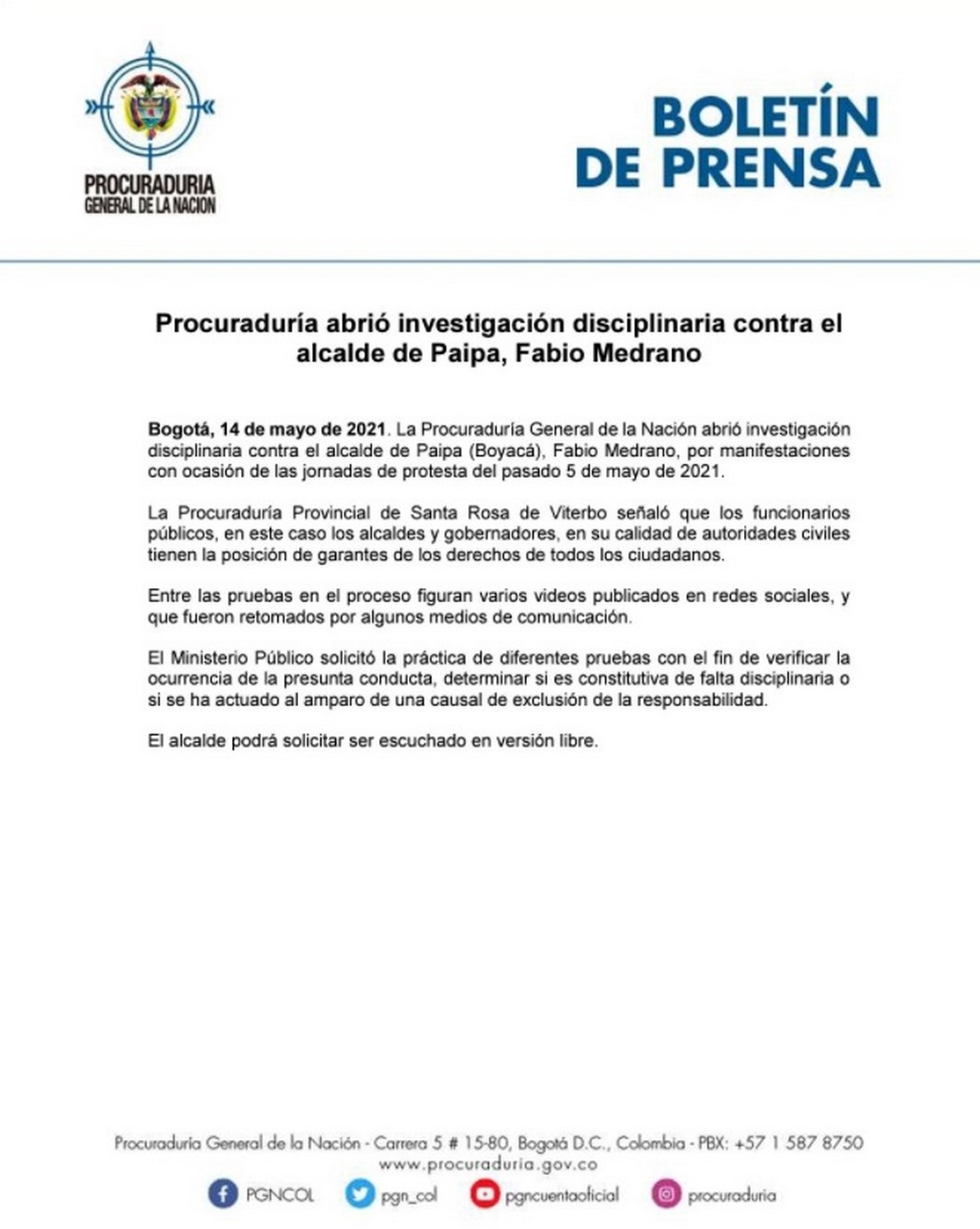 La Procuraduría abrió investigación disciplinaria contra el alcalde de Paipa, Boyacá, Fabio Medrano, por manifestaciones con ocasión de las jornadas de protesta del pasado 5 de mayo de 2021.