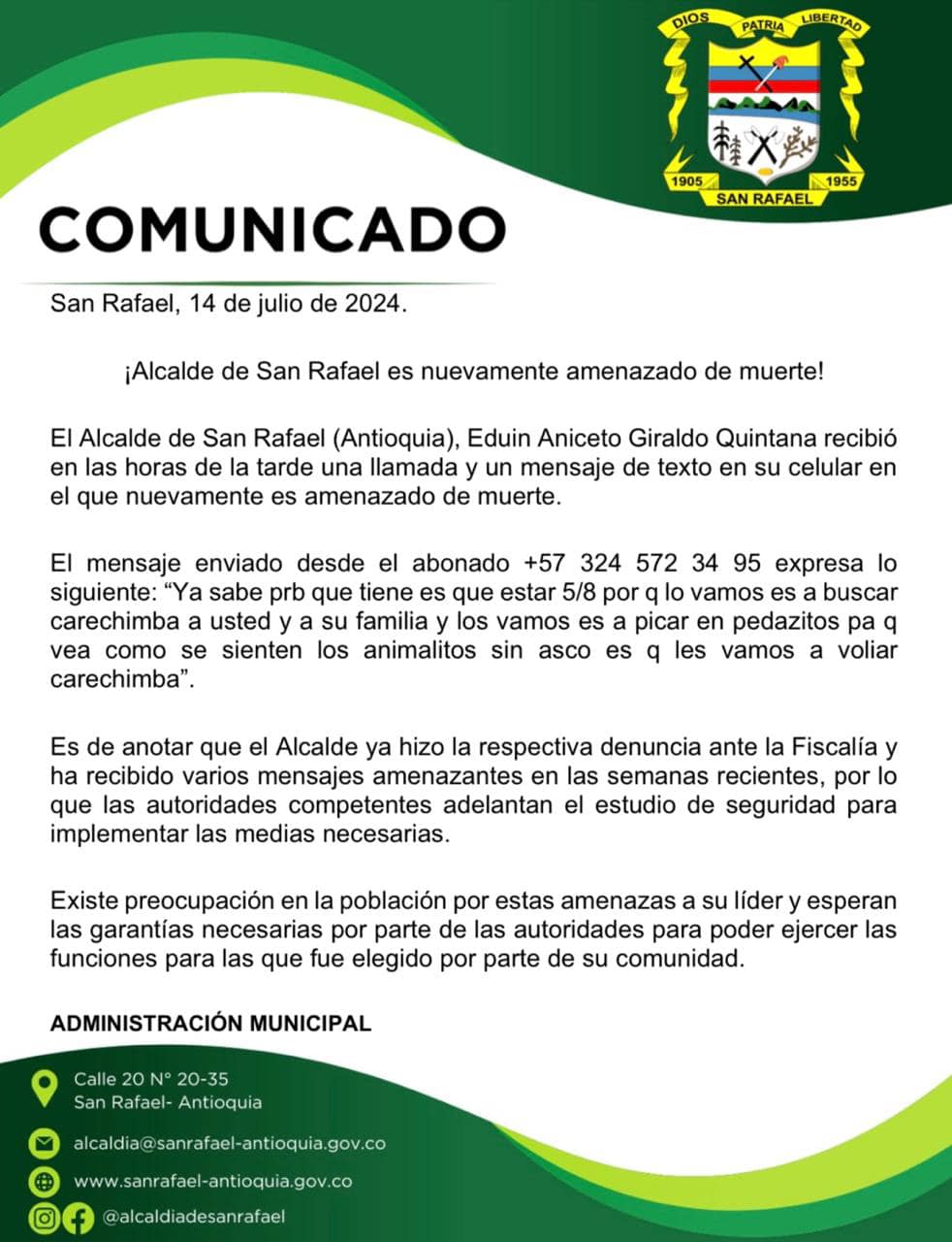 En un preocupante desarrollo, el alcalde del municipio de San Rafael, Eduin Aniceto Giraldo, ha denunciado haber recibido amenazas de muerte en las últimas horas.