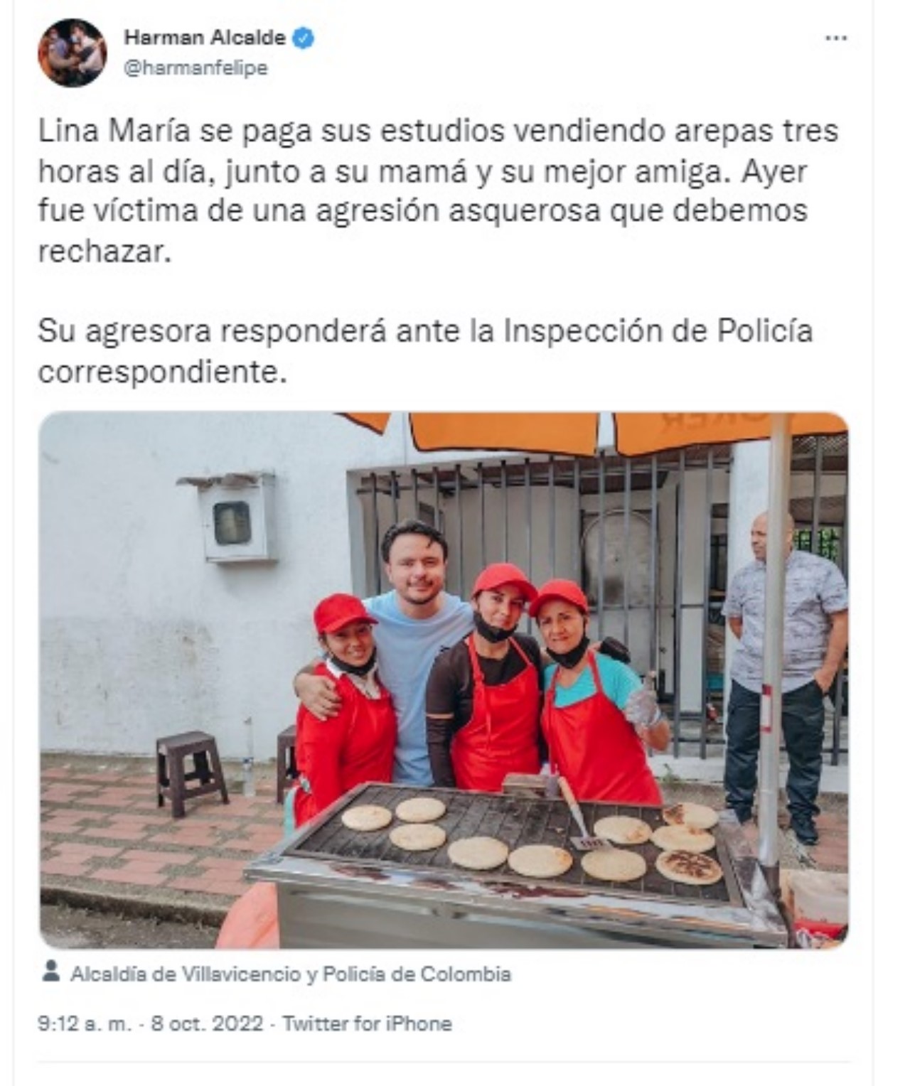 “Lina María se paga sus estudios vendiendo arepas tres horas al día junto a su mamá y su mejor amiga. Ella fue víctima de una agresión asquerosa que debemos rechazar. Su agresora debe responder ante la Inspección de Policía correspondiente”, dijo el alcalde Villavicencio.