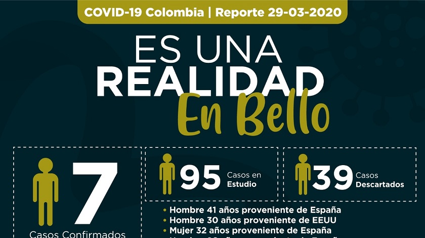En las últimas horas la Alcaldía de Bello ha reportado un total de 7 contagiados con coronavirus en el municipio al norte del Valle de Aburrá. Actualmente en Bello hay 95 casos en estudio y 39 descartados; y se afirma que los contagios siguen en aumento.