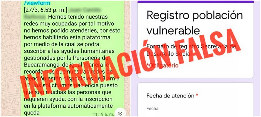 En las redes sociales fue compartido un mensaje con un link con el cual supuestamente las personas podrían inscribirse para recibir las ayudas que está entregando la alcaldía de Bucaramanga a los más necesitados durante la cuarentena, situación que fue desmentida por la administración.
