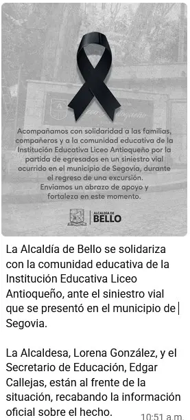 Minuto30.com .- La Alcaldía de Bello ha emitido un comunicado preliminar lamentando el siniestro vial ocurrido recientemente en el municipio de Remedios (Nordeste antioqueño), debido a que las víctimas serían de la comunidad educativa de la ciudad.
