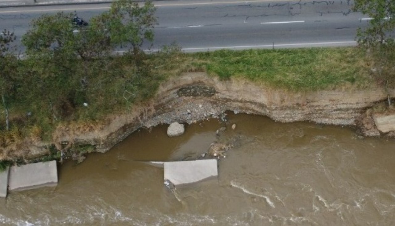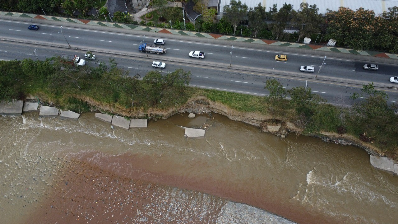 En este momento, el terreno ha cedido y la socavación se encuentra a solo dos metros de la vía principal. En la zona afectada se evidencia erosión del talud y desprendimiento de las placas de concreto que conforman la canalización del río, a lo que se suma el desvío de la corriente hacia la ribera izquierda, por acumulación de sedimentos.