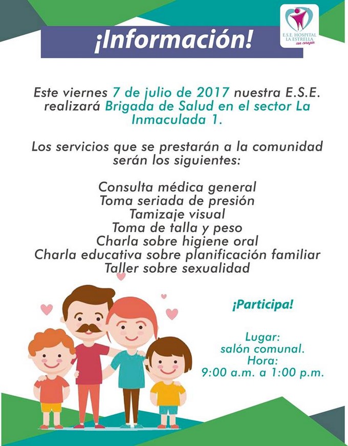 Este viernes 7 de julio, la Alcaldía de La Estrella, desarrollará la Brigada de Salud en el sector Inmaculada 1, a partir de las 9:00 a.m.