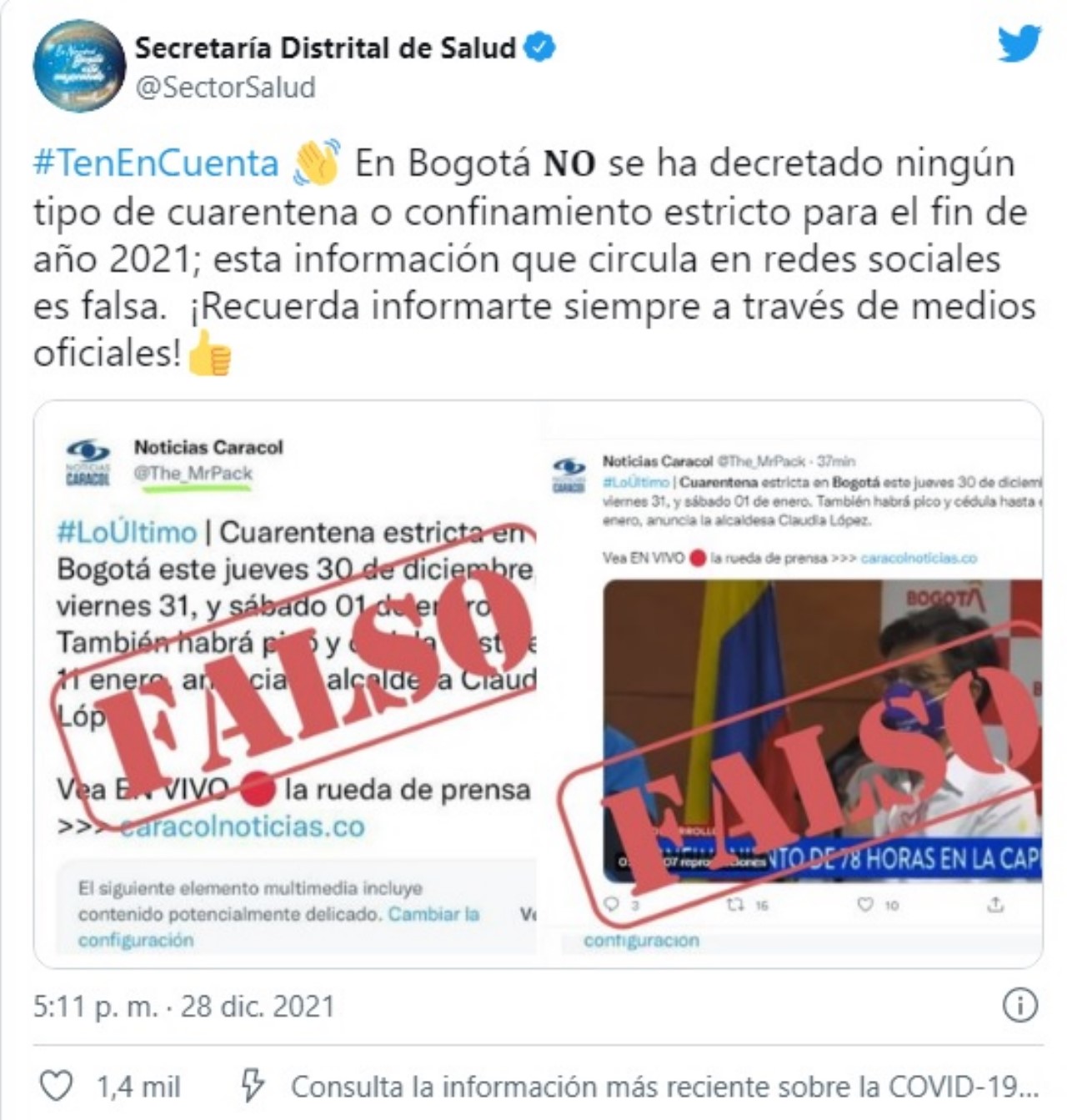 La Alcaldía Mayor de Bogotá se permite informar que a la fecha NO se ha adoptado ningún tipo de medida de confinamiento estricto o cuarentena general por contagio de COVID-19.