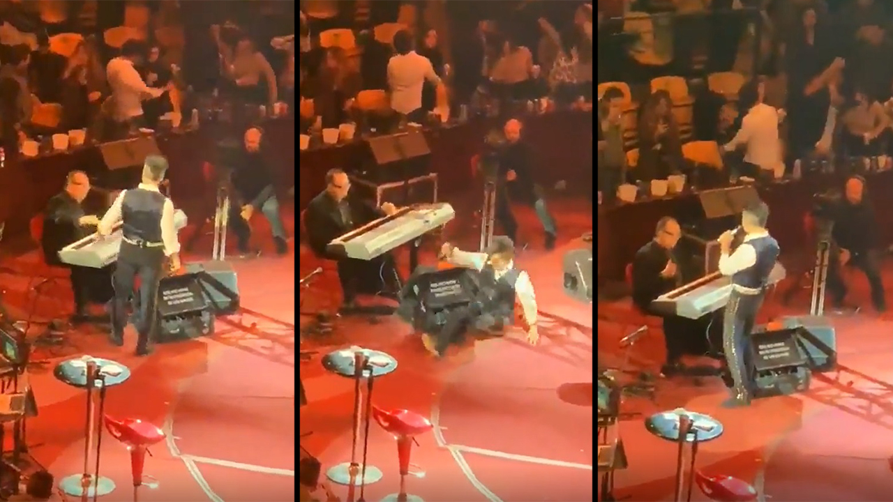 En el video que circula en Twitter, se ve al cantante estar cerca de uno de sus músicos pero al darle la mano no logró sostenerse y se va al suelo.