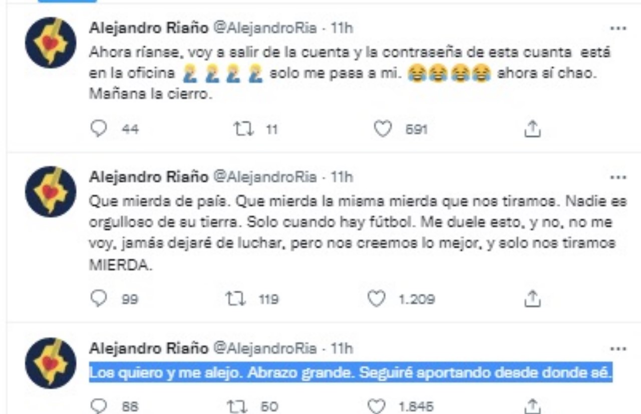 “Los quiero y me alejo. Abrazo grande. Seguiré aportando desde donde sé”, dijo Alejandro Riaño en su cuenta de Twitter.