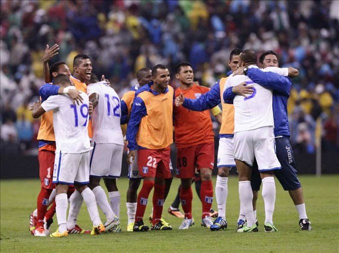 Jugadores hondureños fueron registrados el pasado 6 de septiembre al celebrar la victoria de su equipo sobre México, durante un partido clasificatorio al mundial de fútbol Brasil 2014, en el estadio Azteca de Ciudad de México. EF