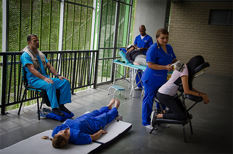 Son las 6 a.m. y amanece en el norte de la ciudad. Álvaro Serna y su grupo llegan a una importante empresa con un objetivo monumental: atender a 1.500 empleados y operarios mediante terapias preventivas para el trabajo. Ese proceso consiste en realizar una lista de chequeo para entender la necesidad de la persona y desarrollar un circuito de actividades terapéuticas para evitarle posturas y lesiones físicas dentro de su lugar de trabajo y en su vida cotidiana.