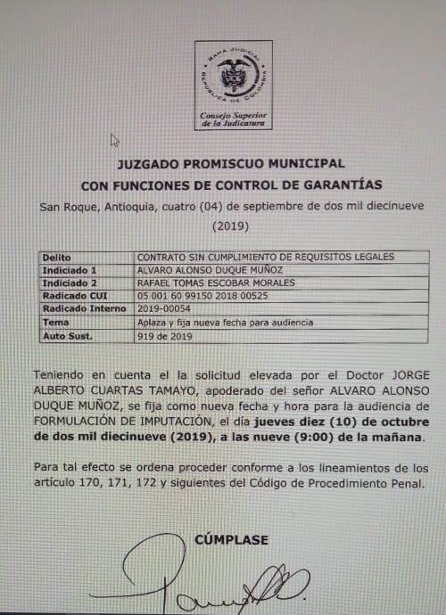 Minuto30.com .- La Fiscalía General de la Nación el pasado 4 de junio radicó solicitud de audiencia de imputación de cargos ante el Juzgado Municipal de San Roque en contra de Álvaro Duque Muñoz, exalcalde y actual candidato a la Alcaldía de la población y de Rafael Tomás Escobar. Dicha diligencia ha sido aplazada en dos ocasiones por lo que fue reasignada para el próximo 7 de noviembre, cuando se espera que se lleve a cabo.