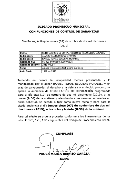 La diligencia inicialmente había sido programada por el Juzgado Promiscuo de San Roque para el día 5 de septiembre, y es cuando la defensa del exalcalde pide el primer aplazamiento, por lo que fue reprogramada para el 10 de octubre, fecha en la que la defensa de Escobar presentó incapacidad médica.