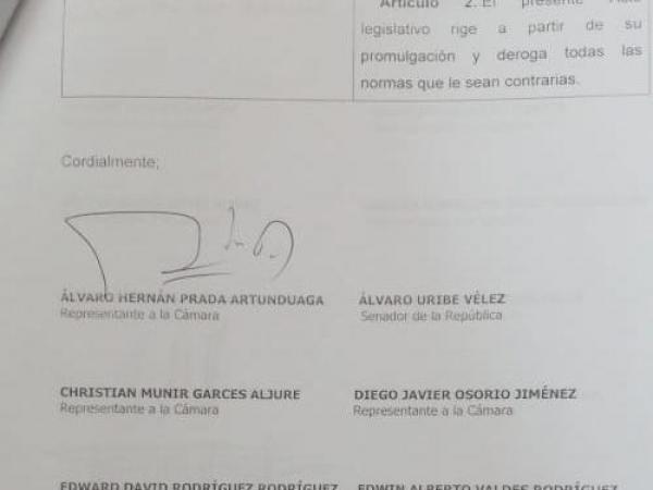 Copia de la radicación del proyecto sin la firma de Álvaro Uribe, foto: El Tiempo.