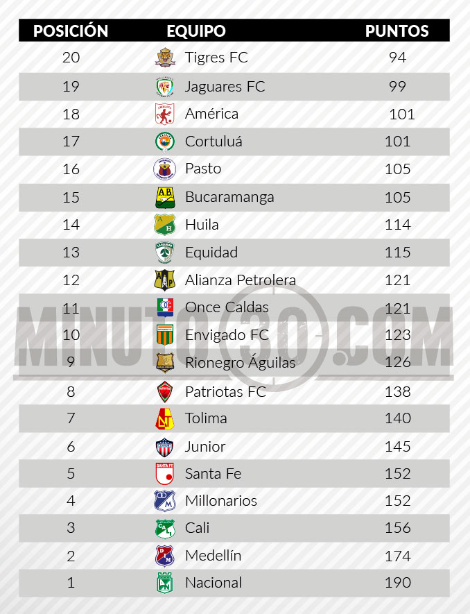 Con la victoria ante el ‘Equipo Corazón’, los ‘Diablos Rojos’ llegar0n a 101 puntos y salieron de la penúltima casilla de la tabla del descenso, en la que ahora aparecen en los dos últimos lugares: Tigres, con 94 unidades, y Jaguares, con 99.