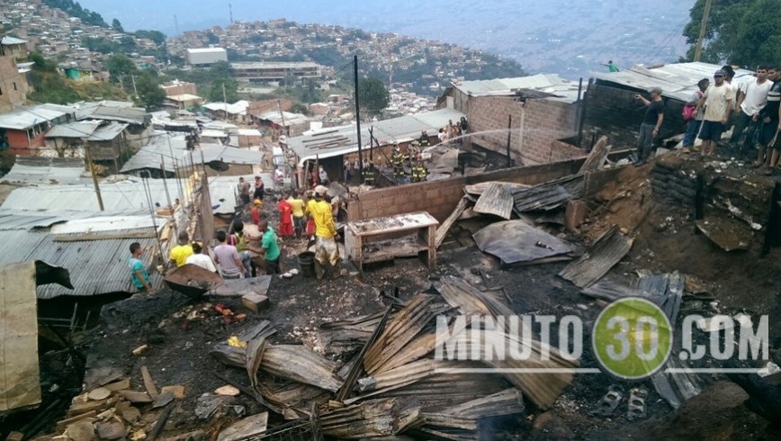 Minuto30.com .- El saldo final del grave incendio que se registró la tarde de este martes 24 de febrero en el barrio Manatiales de la vereda Granizal de Bello fue de 17 casas destruídas, 130 damnificados, dos personas con quemaduras de primer grado y un adulto mayor trasladado a un Centro Hospitalario por inhalación de humo.