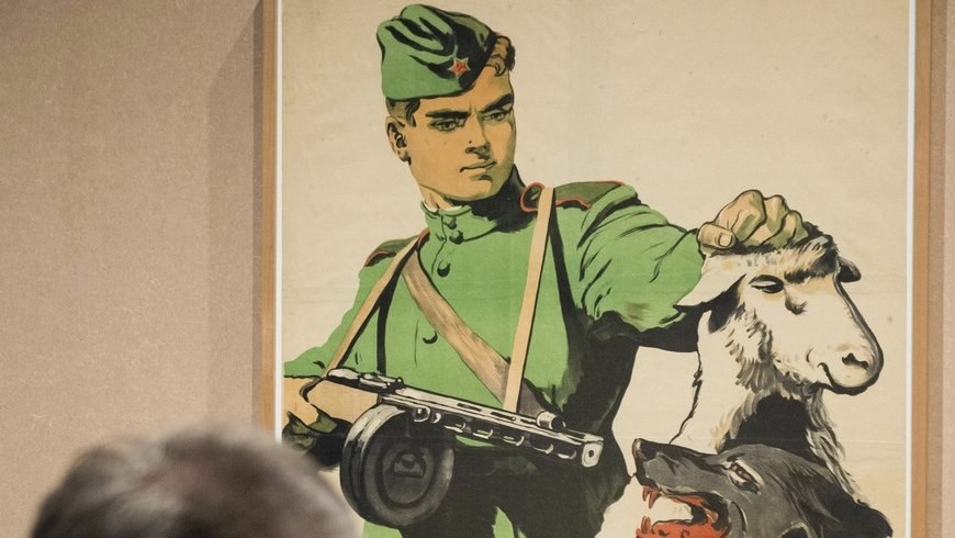 Un hombre observa un cartel soviético fechado en 1945 que reza “El enemigo es astuto, ¡permanece en guardia!” y que forma parte de la exposición “1945. Derrota, liberación, nuevo comienzo”, en el Museo Histórico de Berlín, Alemania. EFE