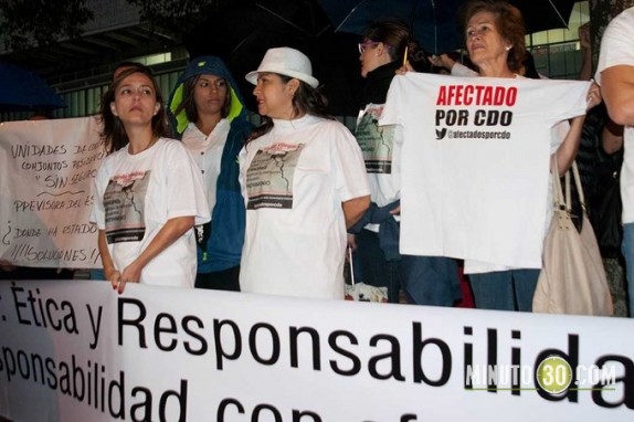 Minuto30.com- Cerca de 40 personas, propietarias de apartamentos en los conjuntos afectados de la empresa CDO, se reunieron ayer a eso de las 5:30 de la tarde en un plantón en las afueras del Teatro Metropolitano. Ellos le solicitaron al Ministerio de Vivienda que intervenga en la recuperación de sus capitales ante la tragedia de la torre 6 del Space y las fallas estructurales en otras unidades residenciales.