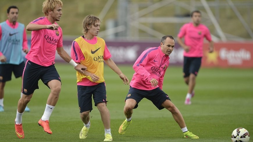 Los jugadores del F.C. Barcelona, Andres Iniesta (d) y Alen Halilovic (c), corren a por el balón durante un entrenamiento. EFE/Archivo