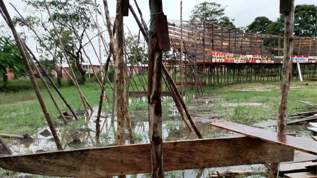 La razón no es otra que el pésimo estado del terreno, el cual se encuentra convertido en un lodazal que impide la instalación segura de los palcos y graderías artesanales.