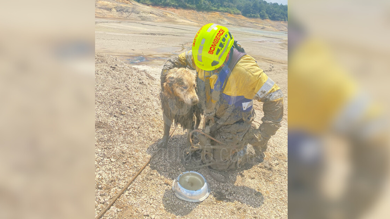 Sin embargo, al internarse en el agua, el perrito quedó atrapado en el sedimento fangoso de la represa, incapaz de liberarse por sus propios medios.