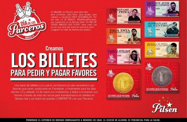 Pues como este viernes y sábado (13 y 14 de marzo) Pilsen celebra el Día de los Parceros, usted nada más pida, que Pilsen se encarga de la tarjeta, o en este caso de los billetes para que pague los favores.