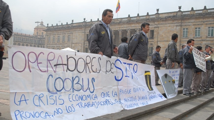 Empleados de la Empresa Coobus, operadora del Sistema Integrado de Transporte SITP, protestan a esta hora frente a la Alcadía Mayor de Bogotá, según ellos por falta de pago.