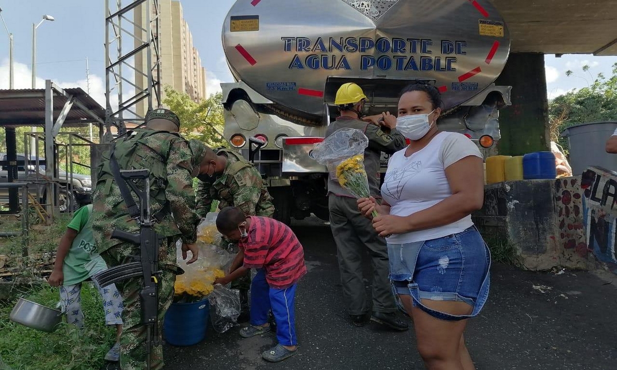 El Ejército y la Policía Nacional, hicieron entrega de 2.500 litros de agua a la comunidad de potable a los habitantes del barrio Guasimalito, en Copacabana-Antioquia, quienes no cuentan con servicio de alcantarillado ni servicios públicos.