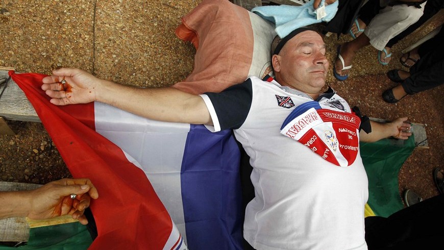 “Los crucificados de Asunción”, los tres exempleados de la represa de Itaipú clavados a un madero frente a la embajada brasileña, cumplieron hoy seis días en esa posición y sin ingerir alimentos, como forma de reclamar los beneficios laborales que dicen se les debe desde la construcción de la faraónica obra.