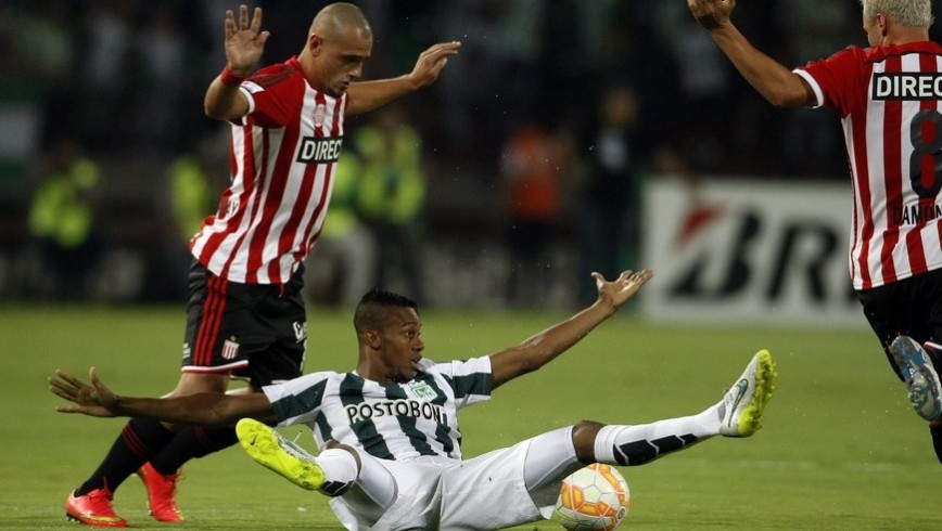 Jonathan Copete (c) de Atlético Nacional ante Matías Aguirregaray (i) de Estudiantes de La Plata, el jueves 5 de marzo de 2015, durante un partido del grupo 7 de la Copa Libertadores de América 2015 en Medellín. EFE