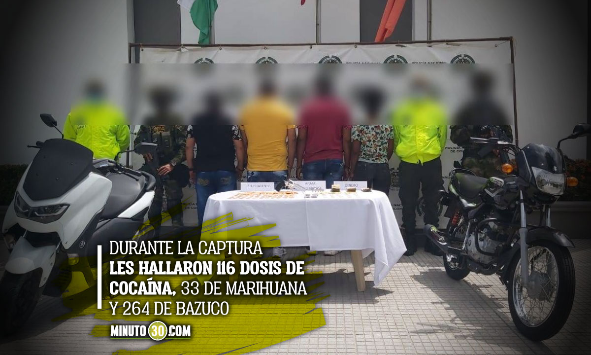 Según el reporte, durante las capturas, les hallaron 116 dosis de cocaína, 33 de marihuana, 264 de bazuco; además de un arma traumática, dinero en efectivo y dos motocicletas.