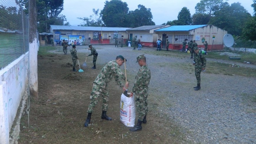 Gracias a la donación de pintura por parte del rector de la Institución Educativa Campobello y la participación en esta actividad del Icbf, la Policía de Infancia y Adolescencia, docentes y los padres de familia, los soldados de los grupos ‘GEOS’ lograron la recuperación de la institución con una jornada de embellecimiento, limpieza, pintura de las aulas escolares, poda y recolección de material vegetal y basuras acumuladas de hace ya varios meses.