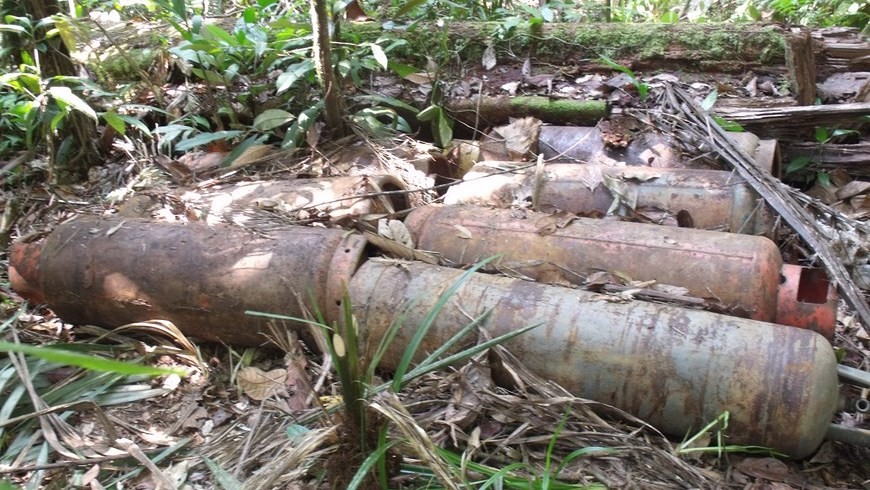 Hasta el sector Montañitas de la vereda Brisas del Duda, en el municipio de Mesetas -Meta-, llegaron soldados acompañados por caninos antiexplosivos. Allí ubicaron una cueva de 10 metros de profunidad en la que estaban escondidos los 23 ‘cilindros bomba’ cargados con 460 kilos de anfo y metralla, por lo que eran considerados de alto poder explosivo.