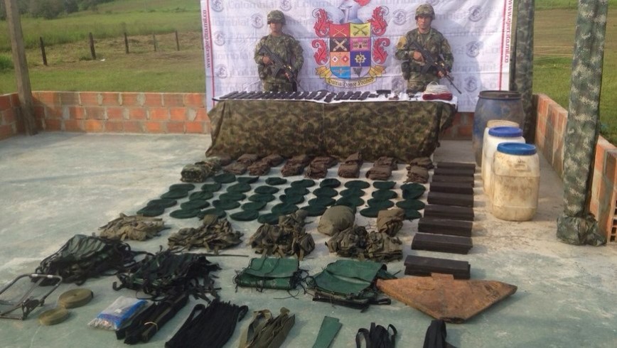 En otro punto de la misma vereda los negritos, tropas de la Fuerza de Tarea Júpiter de la Sexta División del Ejército Nacional, localizaron otro depósito clandestino. Allí fueron encontradas 40 boinas, 52 proveedores de fusil calibre 5.56 mm, una barra de 500 gramos de explosivo tipo pentolita, 255 detonadores eléctricos, dos antenas para radios y material de intendencia.