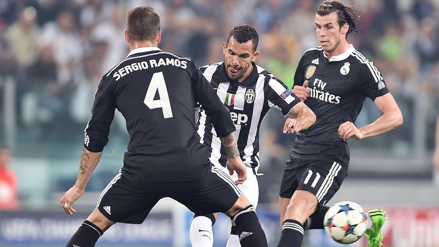 El jugador de Juventus Carlos Tevez (c) patea el balón ante la marca de Sergio Ramos (i) y Gareth Bale (d), de Real Madrid, hoy, martes 5 de mayo de 2015, durante un partido por la serie semifinal de la Liga de Campeones entre Juventus y Real Madrid, en el estadio Juventus de Turín (Italia). EFE/Alessandro Di Marco