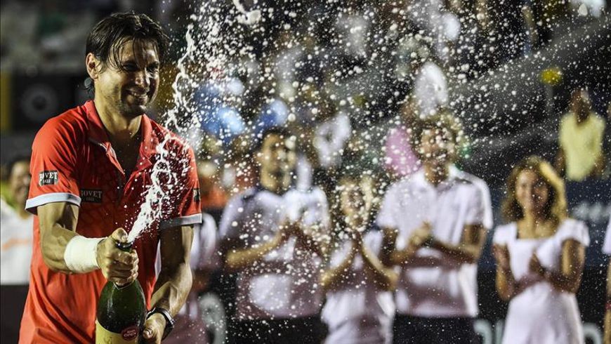 El tenista español David Ferrer fue registrado al celebrar su victoria sobre el italiano Fabio Fognini en la final masculina del Torneo Abierto de Río de Janeiro. EFE