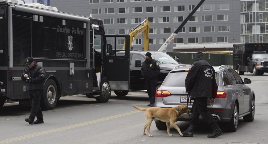 Agentes de policía de Boston inspeccionan varios vehículos a las puertas de la corte federal Joseph Moakley .