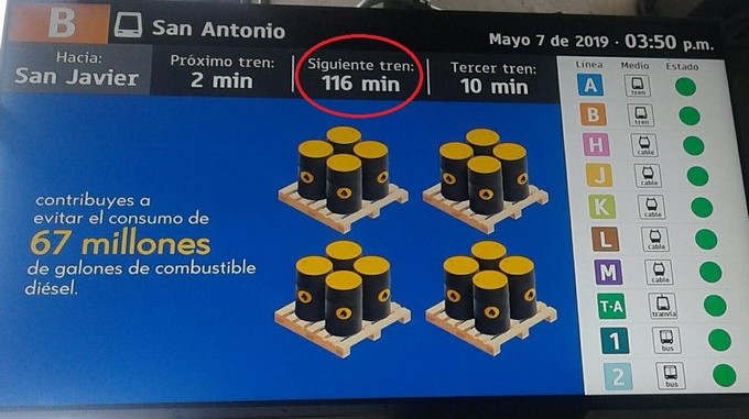 Este martes el Metro de Medellín explicó por qué una de las pantallas del sistema mostró que uno de sus trenes se demoraría 116 minutos en llegar a una estación.