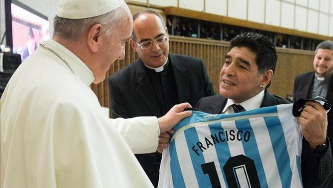 El papa Francisco recibió hoy una camiseta de la selección argentina con el número 10 de manos de Diego Armando Maradona, a quien saludó y abrazó, en el encuentro que mantuvo con los protagonistas del llamado “Partido por la Paz” en el Vaticano.