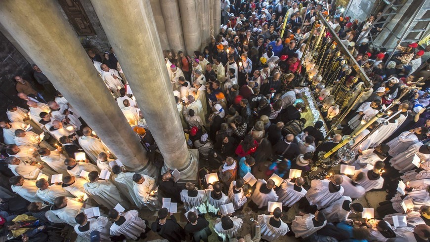 El ritual en torno al Santo Sepulcro incluye también el desfile de monjes franciscanos que dan tres vueltas al lugar donde se supone fue enterrado cristo mientras los feligreses encienden velas.