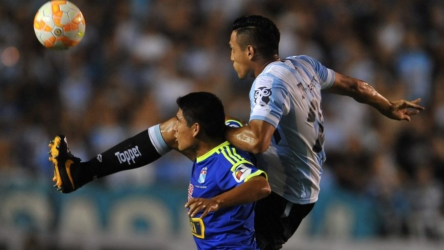 Fotografía tomada el pasado 10 de marzo en la que se registró a Irven Ávila (i), del Sporting Cristal de Perú, al disputar un balón con Yonathan Cabral, del Racing Club de Argentina, durante un partido del grupo 8 de la Copa Libertadores, en Buenos Aires (Argentina). EFE/Archivo