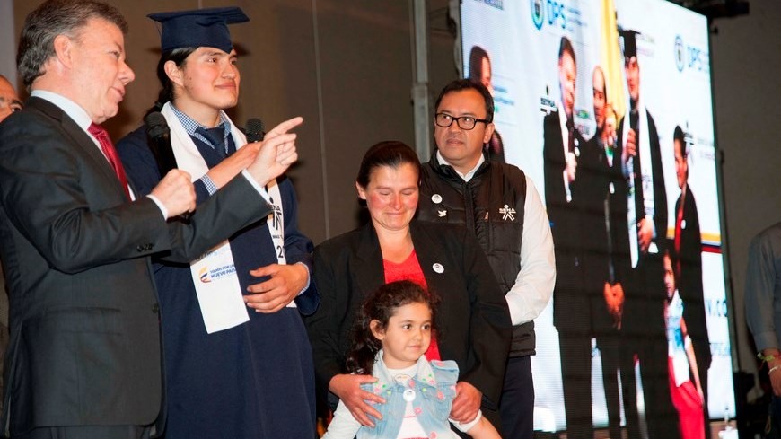 Con él otros 99 jóvenes recibieron sus certificado que los acredita como técnicos y tecnólogos profesionales, los diplomas fueron entregados de manos del presidente de la república Juan Manuel Santos .
