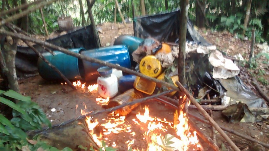 Minuto30.com-. Tres laboratorios para el procesamiento de base de coca y un campamento de las Farc fueron ubicados y destruidos por tropas de la Fuerza de Tarea Nudo de Paramillo en los municipios de Ituango y Valdivia -Antioquia- y en Tierralta -Córdoba-.