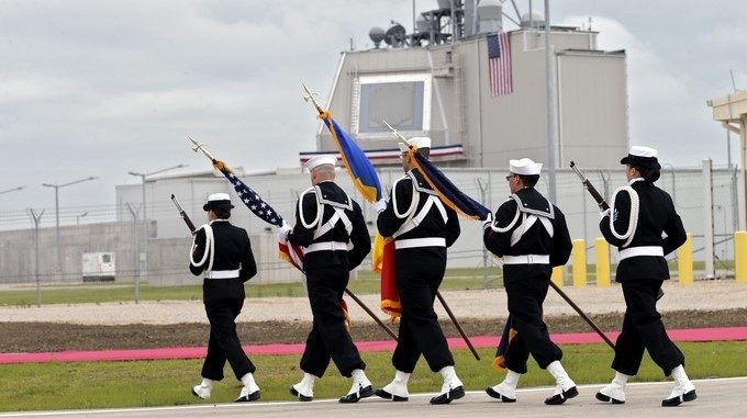 DEV03 DEVESELU (RUMANÍA), 12/05/2016.- Marines estadounidenses durante la ceremonia oficial de apertura de un escudo antimisiles, diseñado y financiado por Estados Unidos, en la base militar de Deveselu, al suroeste de Rumanía, hoy, 12 de mayo de 2016. La OTAN activa hoy el escudo para hacer frente a posibles amenazas desde fuera de Europa, como de Irán, y en medio de protestas de Rusia que lo considera como un desafío a su propia seguridad. EFE/ROBERT GHEMENT