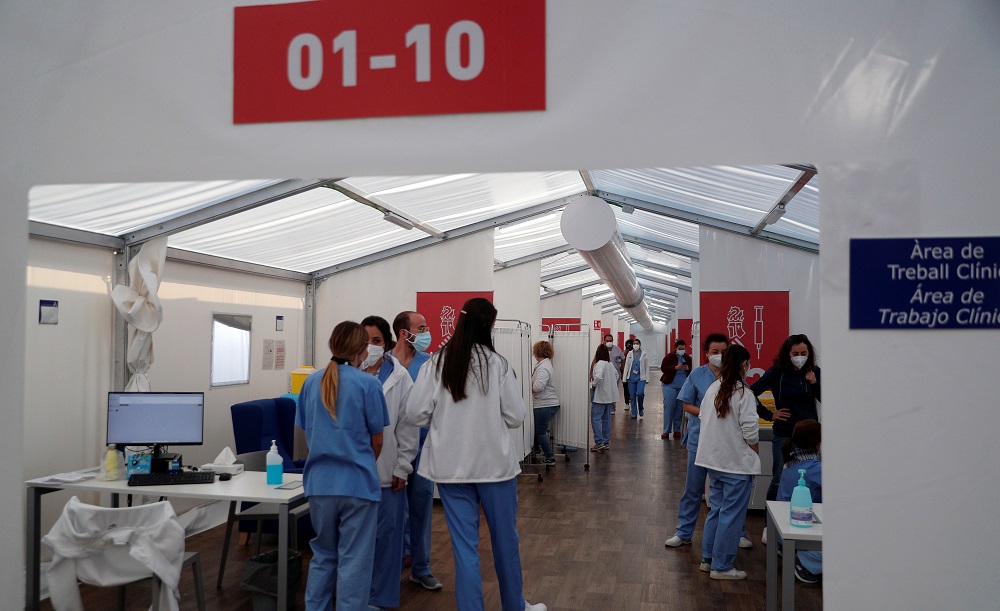 Varios sanitarios en el momento de suspenderse la vacunación con viales de AstraZeneca de miles de docentes de la Comunidad Valenciana en el hospital de campaña de La Fe, de Valencia. EFE/Kai Försterling