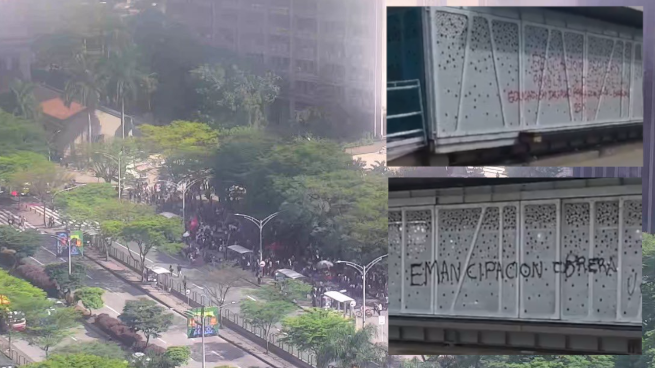 Durante el recorrido, que avanzó por la calle Colombia y la avenida Ferrocarril, un grupo de participantes realizó grafitis en las estaciones de Metroplús, afectando la infraestructura de este sistema de transporte público.
